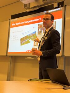 Tijdens de gastles van burgemeester Heijkoop maakten studenten kennis met zijn dagelijkse taken rond bestuur, veiligheid en handhaving. Ook vertelde hij over zijn rol als voorzitter van de veiligheidsregio en zijn rol als burgervader van Leiden en bij officiële gelegenheden.