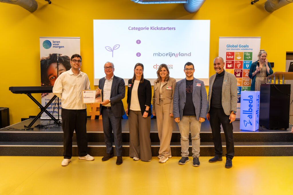mboRijnland is al enkele jaren betrokken bij het leernetwerk van Leren voor Morgen. “mboRijnland valt op door de manier waarop ze studenten bevragen over hun ervaring met duurzaamheid. Honderden studenten vulden een vragenlijst in en tientallen willen meedenken over vervolgstappen”, aldus Roos Wemmenhove van Leren voor Morgen, die de prijs samen met twee studenten van JOBmbo en Studenten van Morgen uitreikte.